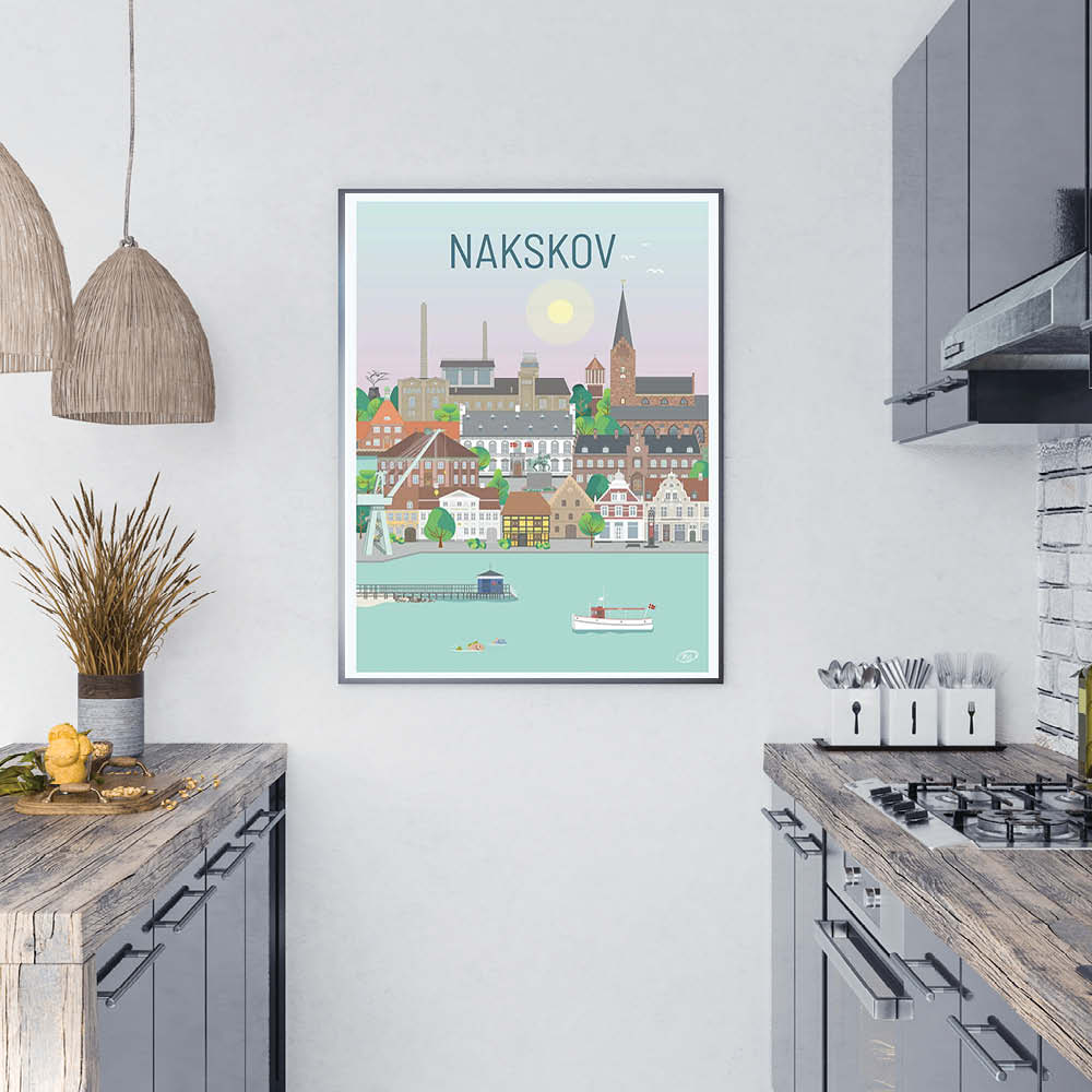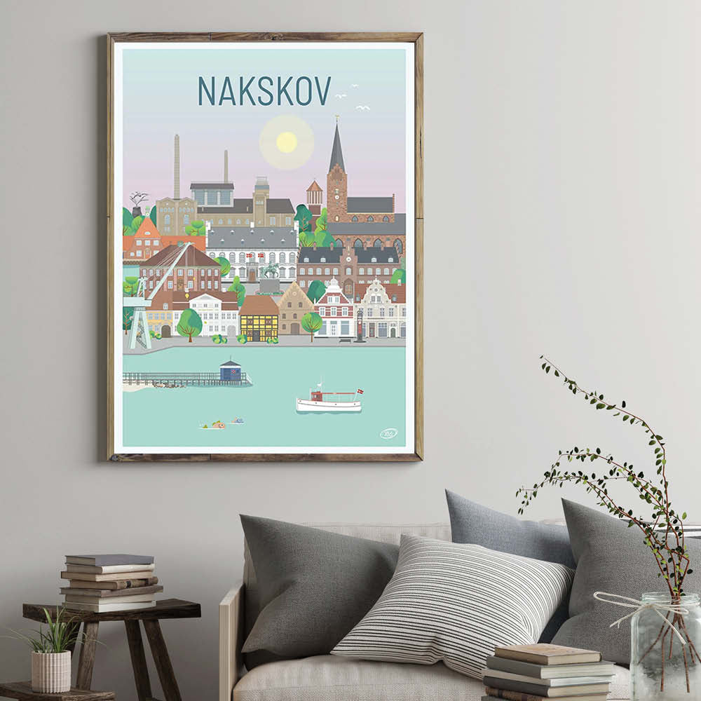 En flot og detaljeret byplakat udarbejdet af Vilakula med motiv af flotte Nakskov. På plakaten finder du blandet andet Nakskov kirke med Nakskov Fjord foran og Nakskov Skibs- og Søfartsmuseum. Vilakula har fanget byens stemning samt flere af byens flotte bygningsværker. Den smukke Nakskov plakat er designet i et farverigt univers der vil pynte smukt på væggene i ethvert hjem, og skaber en kontrast til de sort/hvide hjem.