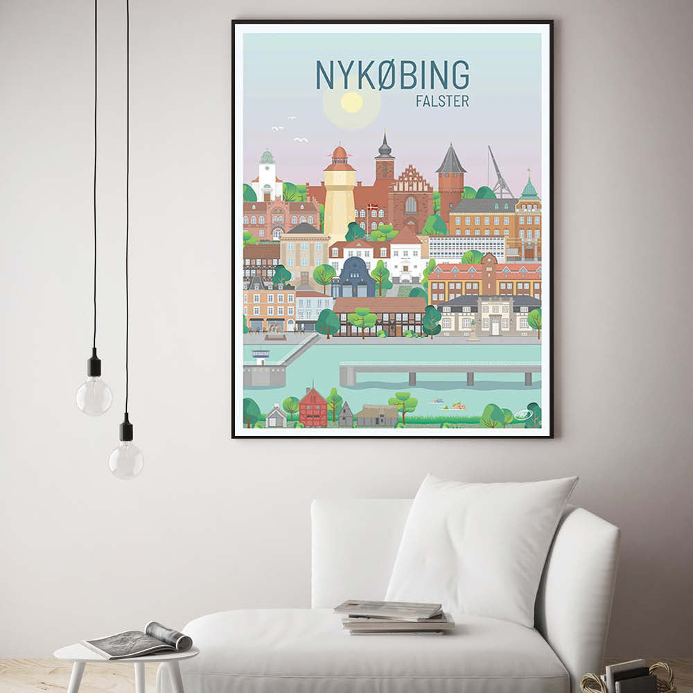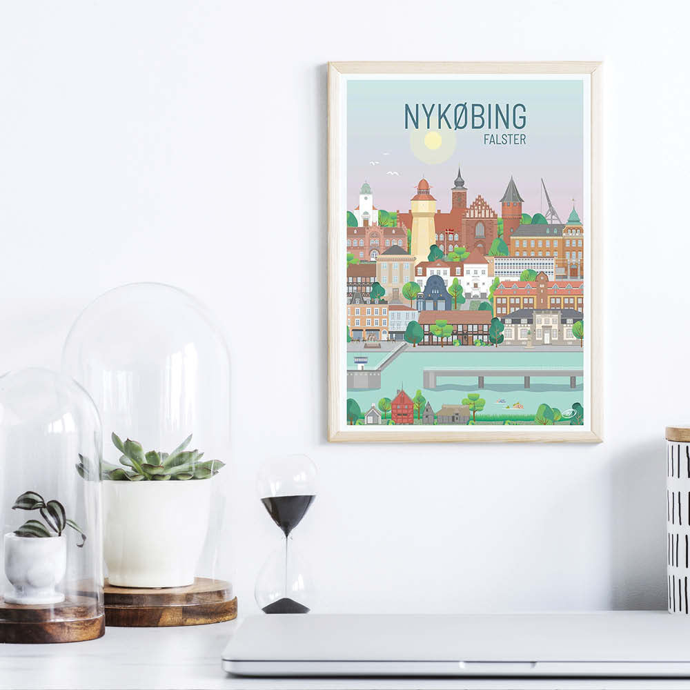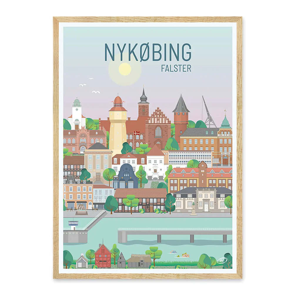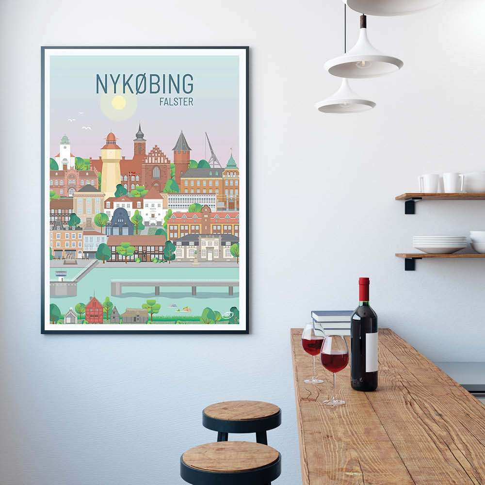 En flot og detaljeret byplakat udarbejdet af Vilakula med motiv af flotte Nykøbing Falster. På plakaten finder du blandet andet Nykøbing Falsters vandtårn der står midt i byen, Middelaldercentret og havnemiljøet. Vilakula har fanget byens stemning samt flere af byens flotte bygningsværker. Den smukke Nykøbing Falster plakat er designet i et farverigt univers der vil pynte smukt på væggene i ethvert hjem, og skaber en kontrast til de sort/hvide hjem.