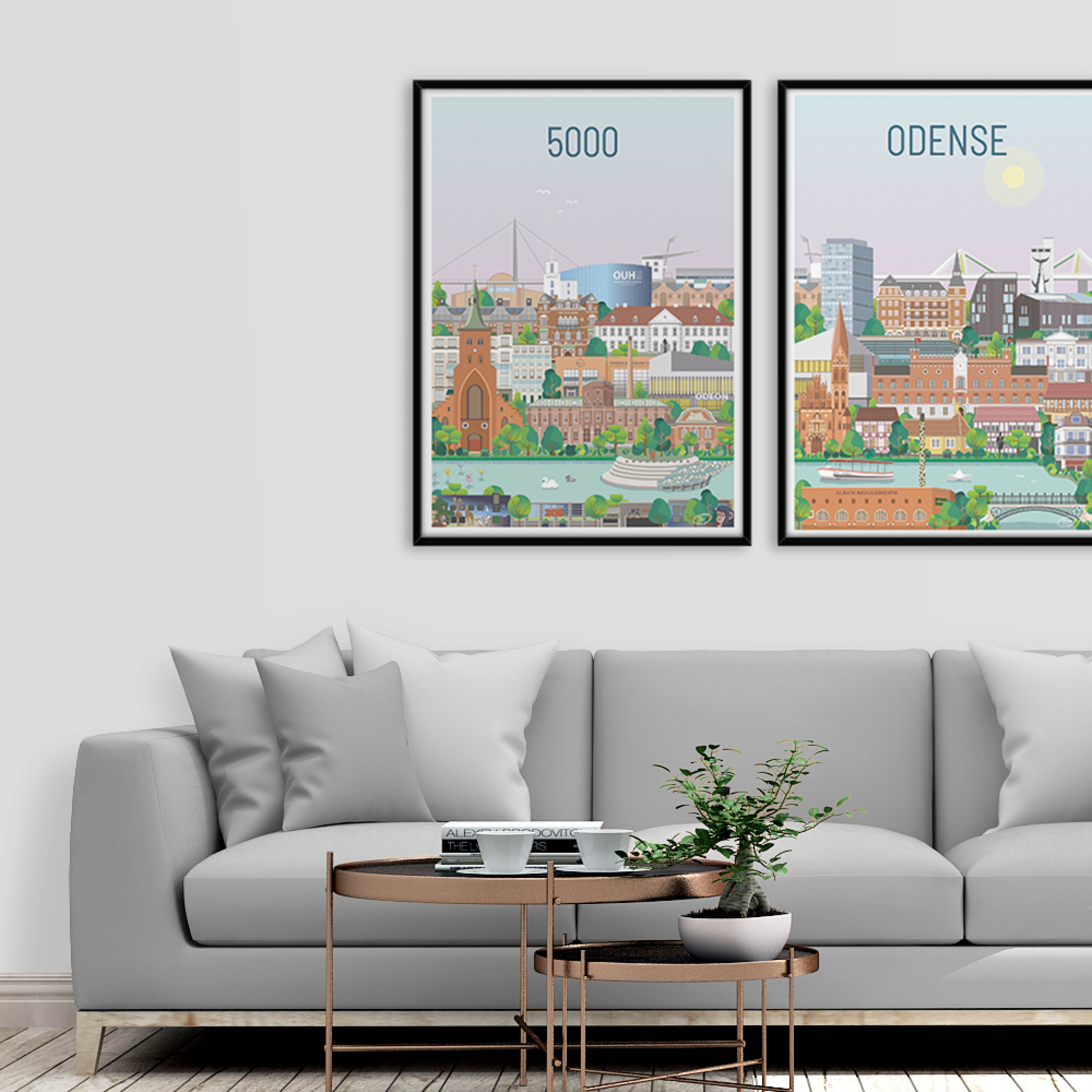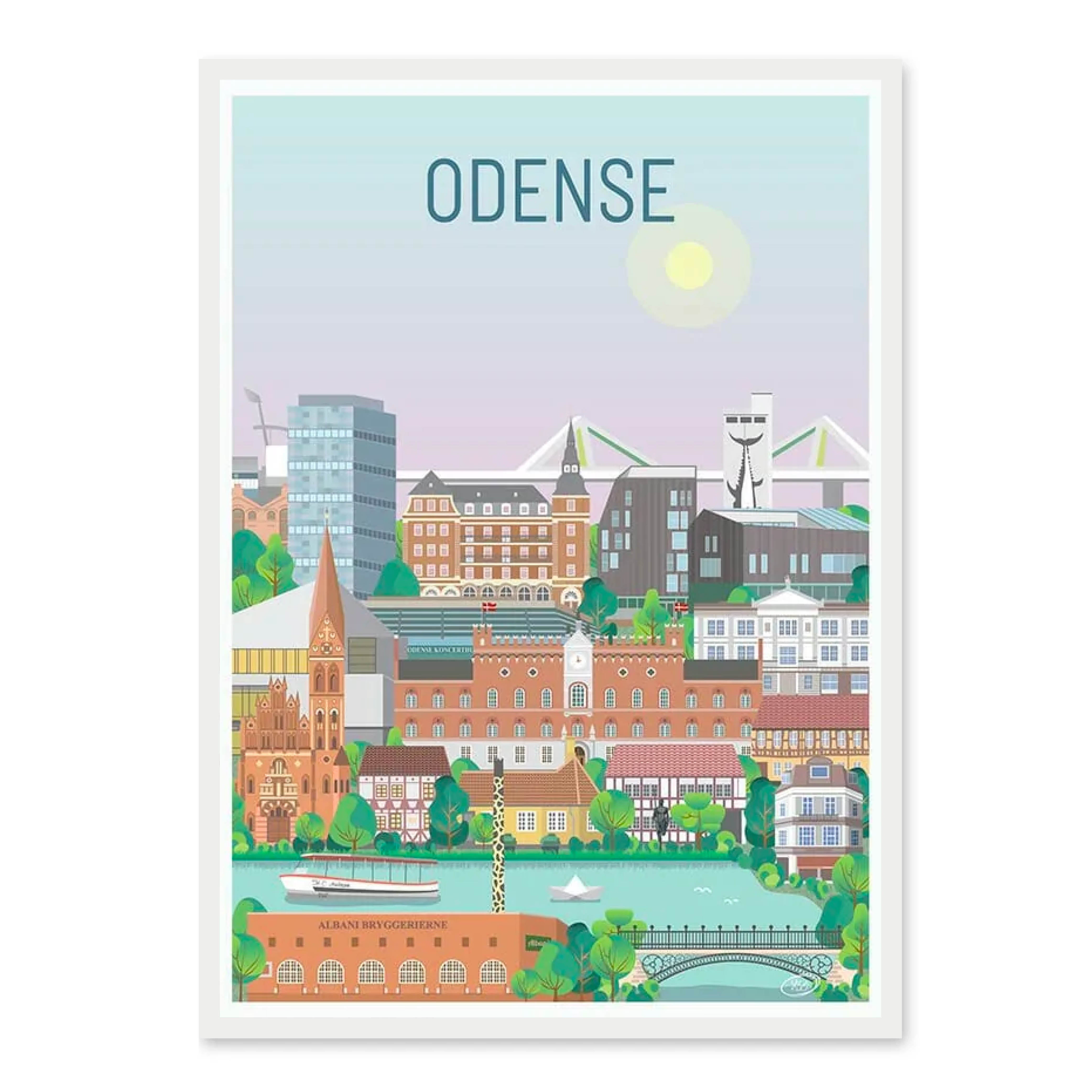 En smuk og detaljeret byplakat udarbejdet af Vilakula med motiv af skønne Odense. Her har de fanget byens stemning. Vilakula har fanget flere smukke bygninger på deres plakat. Du kan bl.a. finde Albani bryggeriet med giraf skorstenen, Kramboden, Sankt Albani kirke, Nordatlantisk Hus, Odins bro, Den standhaftige tinsoldat og Papirbåden. Den smukke Odense plakat er designet i et farverigt univers der vil pynte smukt på væggene i ethvert hjem, og skaber en kontrast til de sort/hvide hjem.