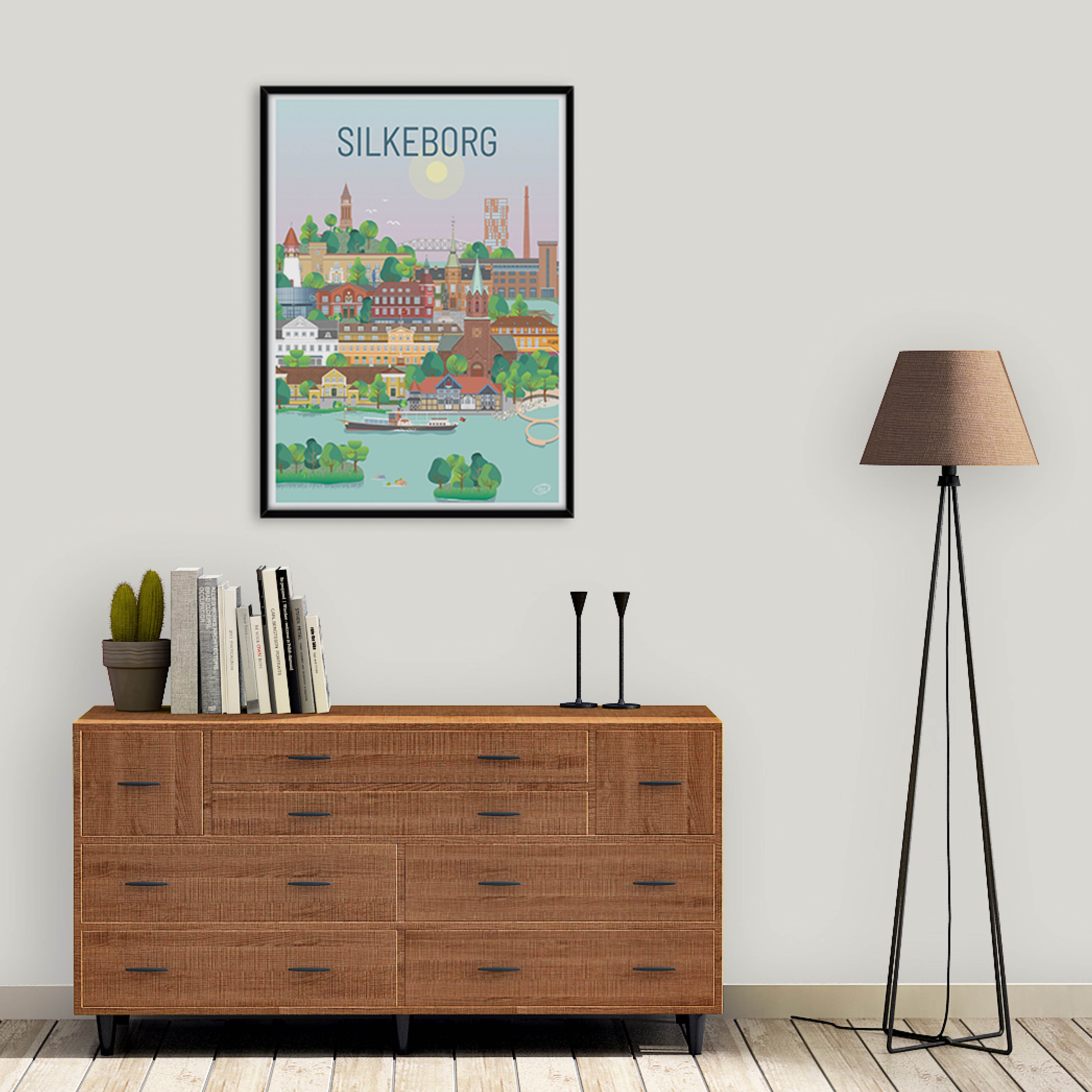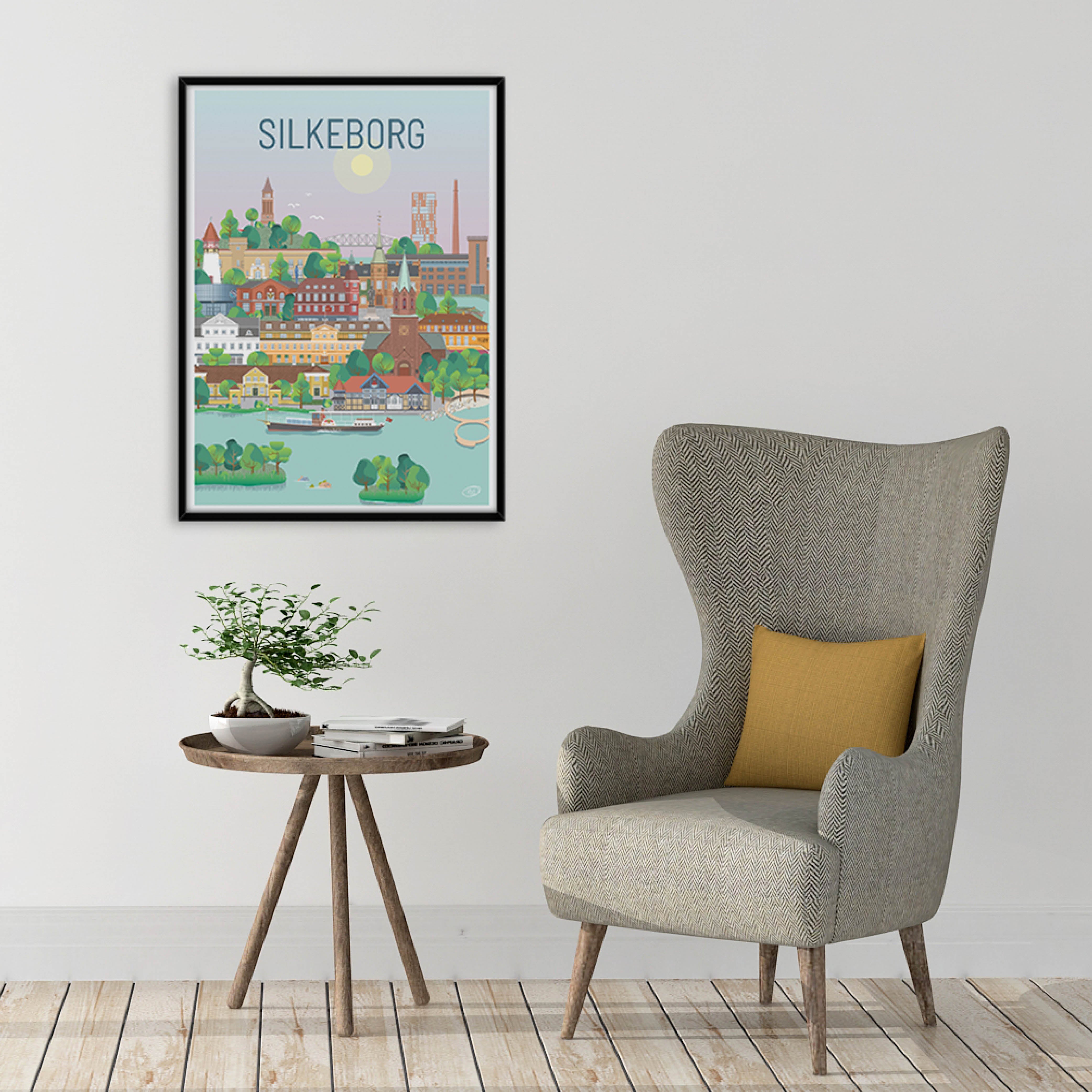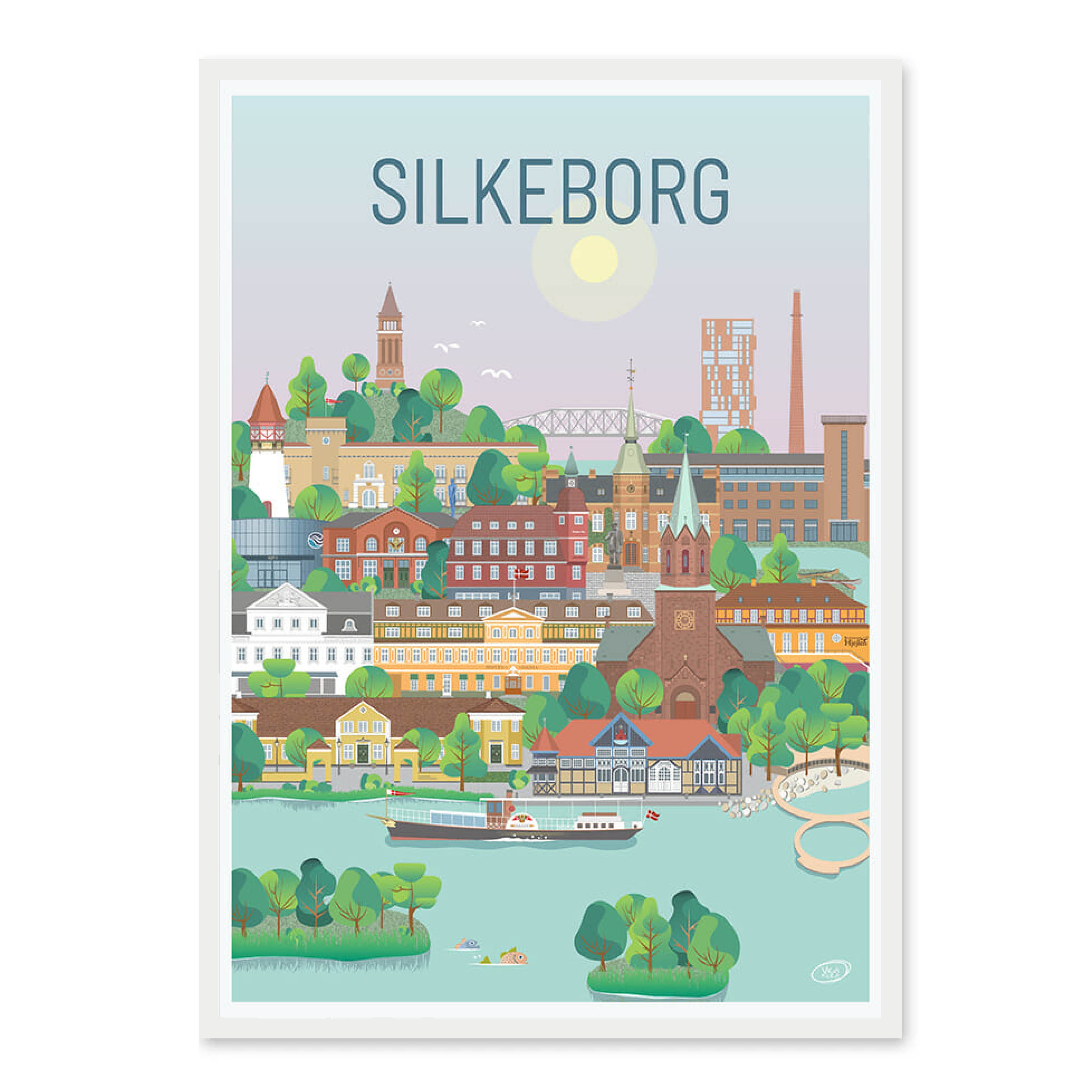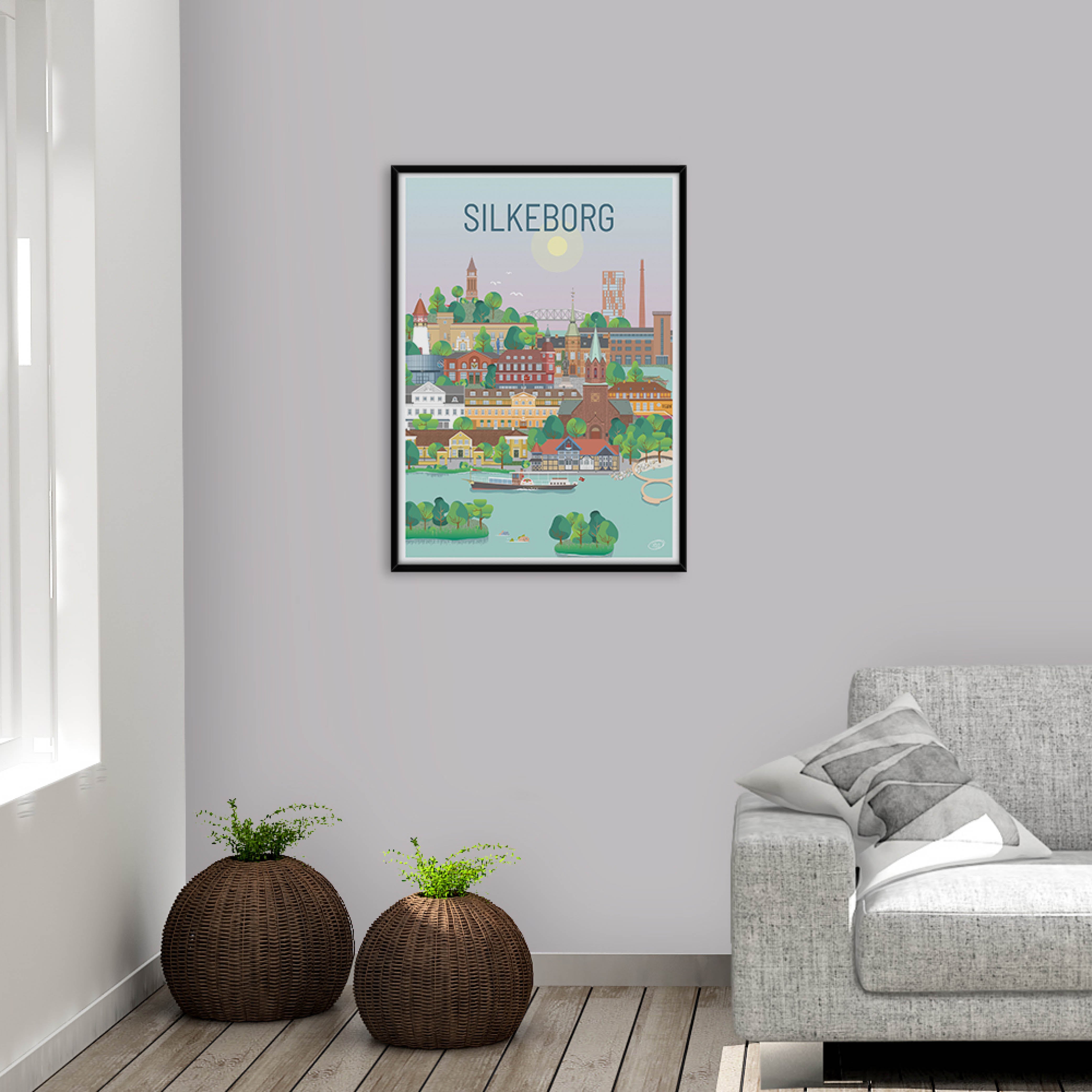En smuk og detaljeret byplakat udarbejdet af Vilakula med motiv af skønne Silkeborg. Her har de fanget byens stemning samt flere af byens flotte bygningsværker. Den smukke Silkeborg plakat er designet i et farverigt univers der vil pynte smukt på væggene i ethvert hjem, og skaber en kontrast til de sort/hvide hjem.